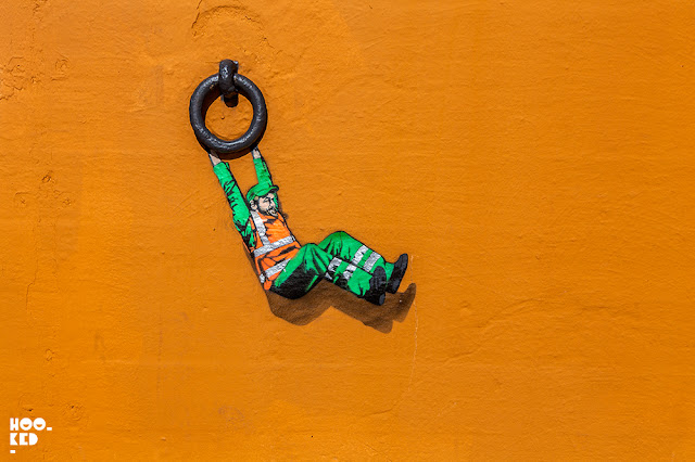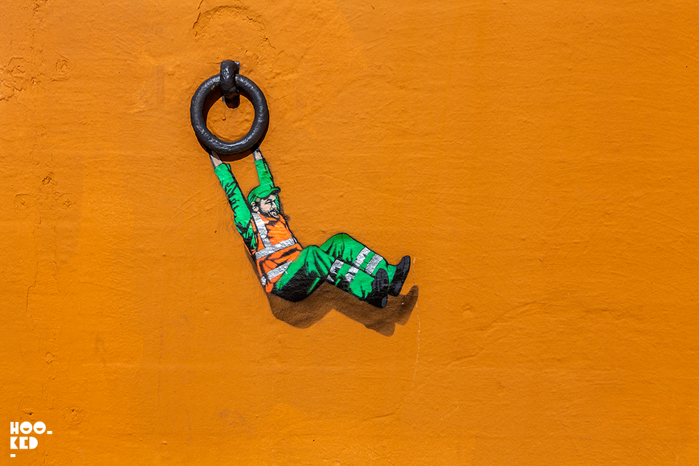 Following completion of the first piece, the artist had spotted a second location where he wanted to install some work. The corner wall of this house close to Tou Scene had a comedy cock sprayed onto the wall and Jaune decided to add one of his sanitation worker stencil characters with a roller brush that perfectly fitted the wall.