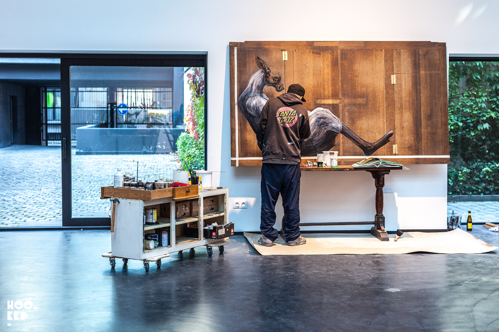 ROA at work on one of the large pieces painted on wooden panel reclaimed from an old church during his six-week residency in the gallery.