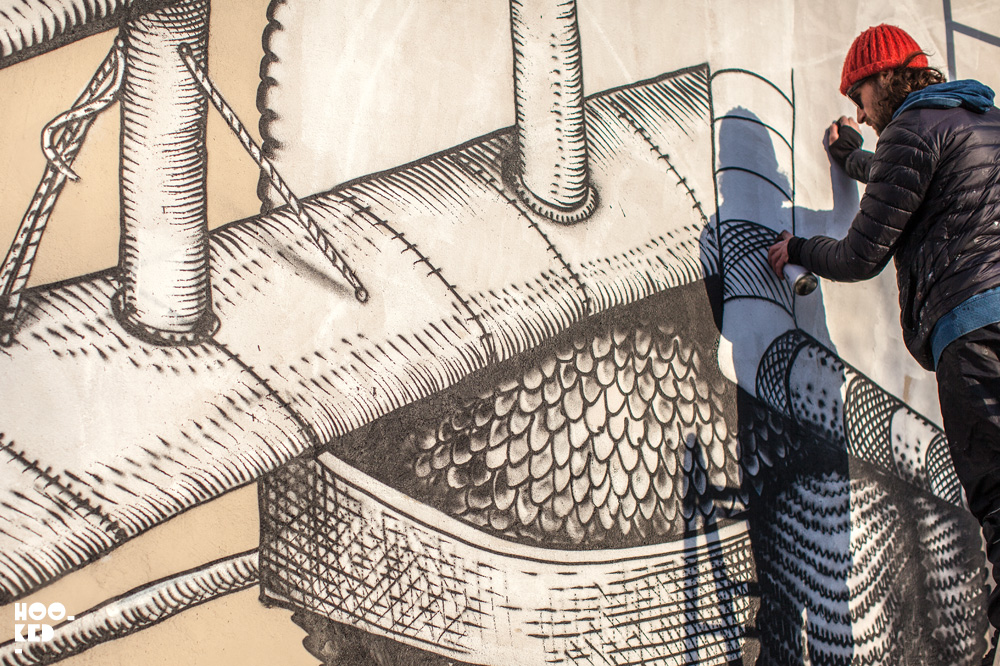 We had seen some work in progress images shared on social media on a Friday and with bitter cold temperatures we were surprised to hear that street artist Phlegm was still painting in these temperatures in East London.